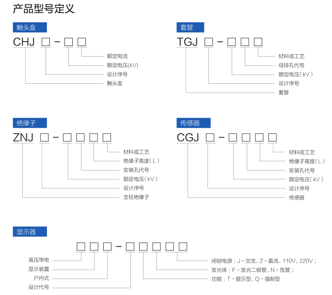 訂貨須知 1、訂購絕緣筒、 觸頭盒時, 請?zhí)峁┊a(chǎn)品型號、 額定電壓; 2、定購套管時, 請?zhí)峁┊a(chǎn)品型號及母排孔大小、 是否加熱縮套; 3、訂購絕緣子、 傳感器時, 請?zhí)峁┊a(chǎn)品型號、 安裝孔相距螺孔大小及產(chǎn)品高度; 4、訂購帶電顯示器時, 請?zhí)峁┊a(chǎn)品型號、 功能; 5、用戶如需產(chǎn)品的外形尺寸或技術(shù)參數(shù)變動, 訂購時請加以特別說明; 我公司可根據(jù)用戶需要負(fù)責(zé)全面 的設(shè)計(jì)和開發(fā)服務(wù)。 |